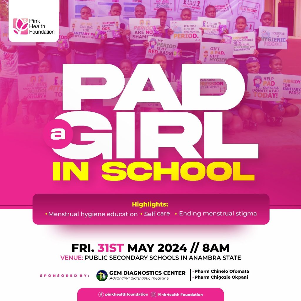 The Pink Health Foundation is proud to present the PAD A GIRL EVENT 2025 — a powerful initiative themed “Pads For Her”, designed to support out-of-school girls with essential menstrual hygiene products. This community-based project is organized to mark the World Menstrual Hygiene Day 2025, and we’re taking it to where it’s needed most! DATE: Wednesday, 28th May 2025 VENUE: Communities in Onitsha, Awka, Agulu,  Ekwulobia (all in Anambra State), Delta State, Ogun State, and Lagos State. Proudly sponsored by: Neimeth Pharmaceutical Akudozuruora Humanitarian Initiative. Supported by:ISPOR Unizik Chapter. #End_period_poverty #pads_for_her #pinkhealthng